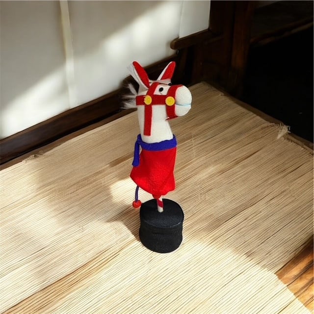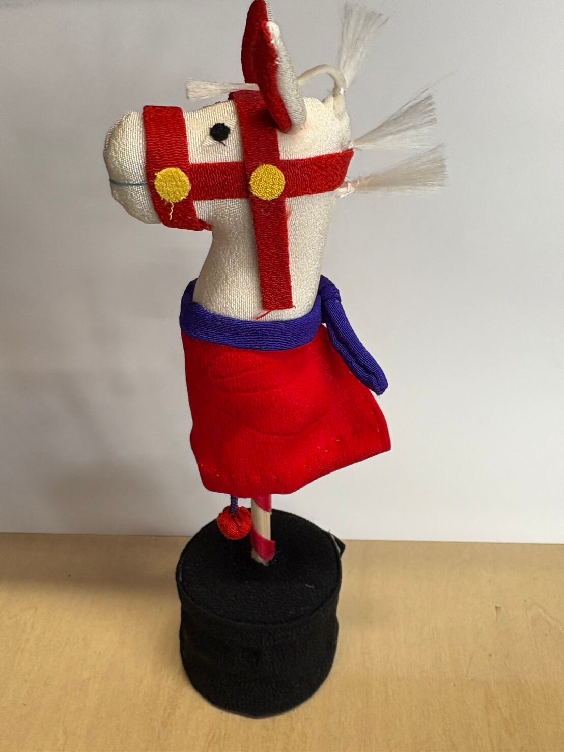 赤い衣装をまとった、どこか愛嬌のあるお馬さんの民芸人形。